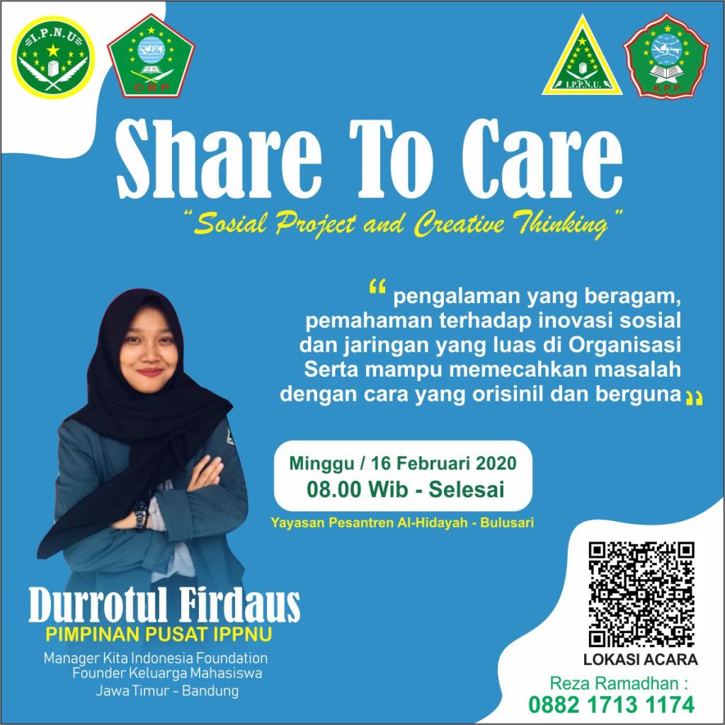 Untuk mempererat silaturrahmi seluruh pengurus dan anggota PAC/PR/PAR/PK se- IPNU IPPNU Gempol , kami mengharap kehadiran Rekan/Rekanita pada acara SHARE TO CARE “social project and creative thinking” yang insyaallah akan dilaksanakan pada :